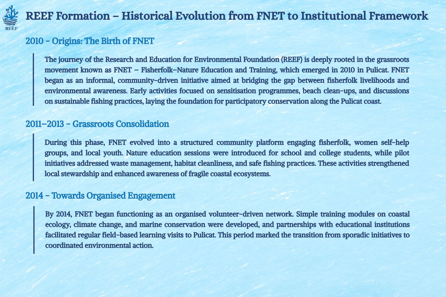 REEF emerged from years of grassroots engagement with FNET – Fisherfolk-Nature Education and Training, a community-based movement initiated in 2010 as a platform to connect fisherfolk livelihoods with environmental conservation. What began as an informal knowledge-sharing and action platform gradually evolved into a structured model of community engagement, and in 2015, FNET was formally recognised as a registered body, strengthening its role in organised education, training, and conservation interventions.