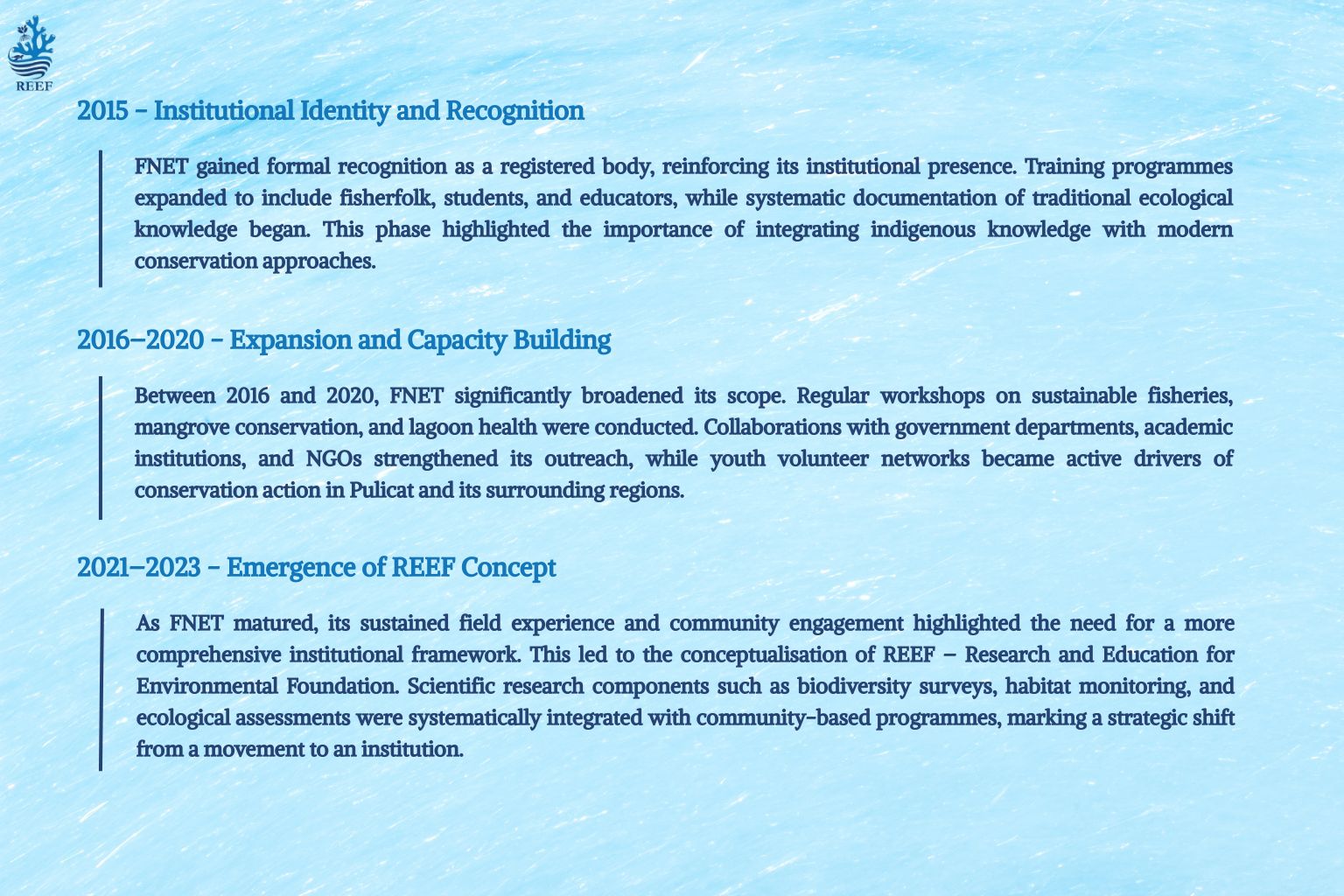 REEF emerged from years of grassroots engagement with FNET – Fisherfolk-Nature Education and Training, a community-based movement initiated in 2010 as a platform to connect fisherfolk livelihoods with environmental conservation. What began as an informal knowledge-sharing and action platform gradually evolved into a structured model of community engagement, and in 2015, FNET was formally recognised as a registered body, strengthening its role in organised education, training, and conservation interventions.